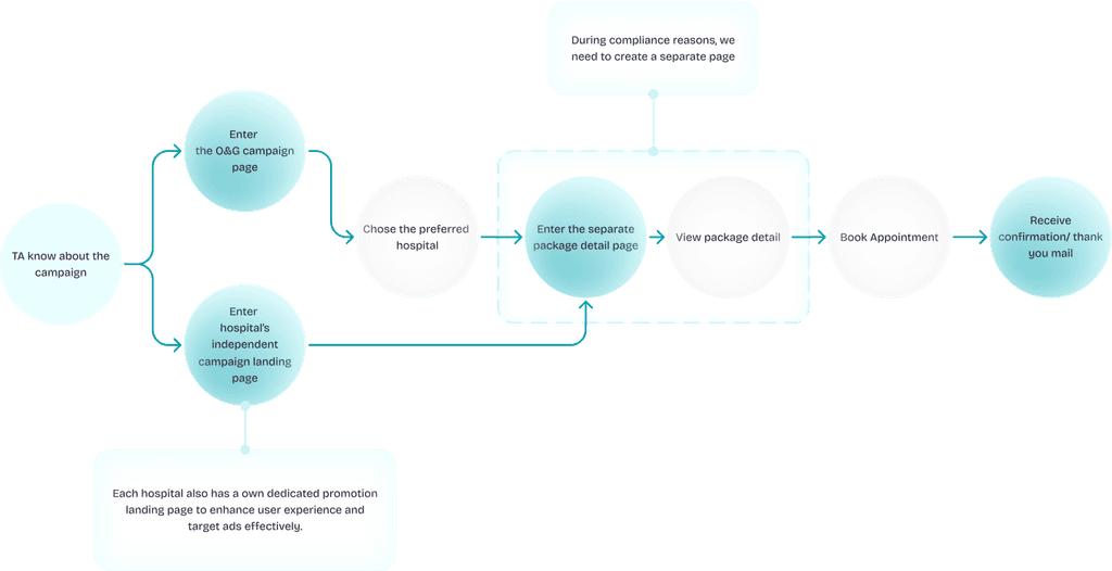 Landing Page: The campaign’s landing page is also designed as a set of template, including a main page and customized sub-pages for each hospital. This setup gives each branch its own space, reducing internal competition. Additionally, clients receive a customized thank you/ confirmation email based on each branch’s promotion when they submit their bookings.