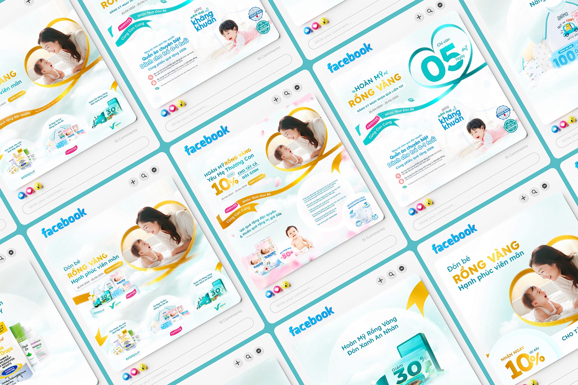 Social Post: Created two sets of five customizable templates—one for Hoan My branch hospitals and another for Hanh Phuc Hospital (a Hoan My subsidiary). The designs ensure brand consistency while allowing flexibility for each branch’s unique needs. For example, while posts feature sponsored products, not all 11 branches share the same sponsors due to differing requirements or limited availability.
